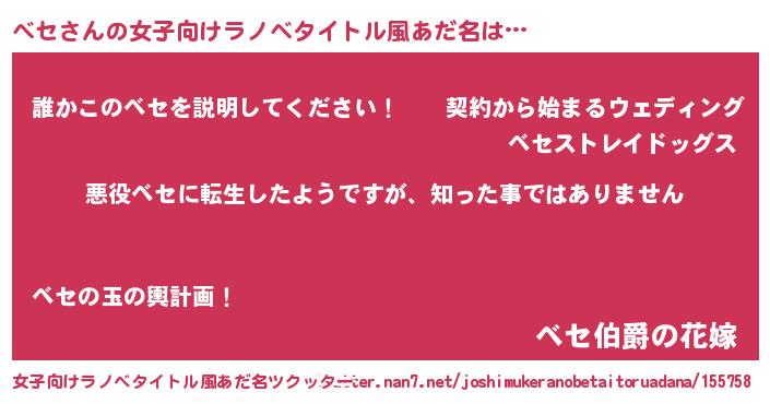 | 男性向けラノベタイトル風あだ名 | 『この素晴らしい世界にベセを!』 |