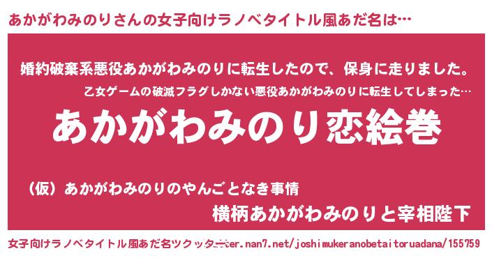 あかがわみのりさんの女子向けラノベタイトル風あだ名は… 『あかがわみのり恋絵巻』『婚約破棄系悪役あかがわみのりに転生したので、保身に走りました。』『横柄あかがわみのりと宰相陛下』 ツクッター #女子向けラノベタイトル風あだ名ツクッター http://tkutter.nan7.net/joshimukeranobetaitoruadana/155759/