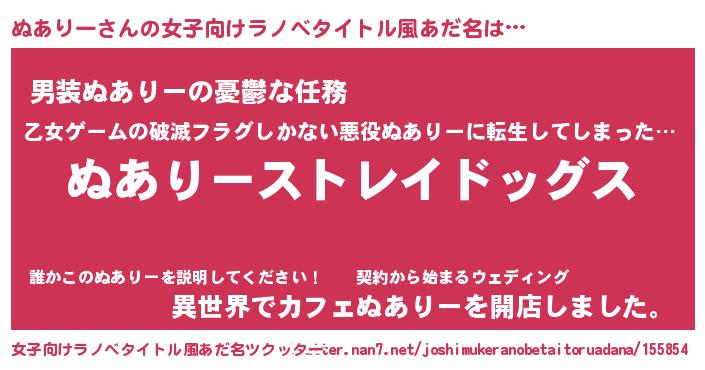 | 男性向けラノベタイトル風あだ名 | 『Re:ぬありーから始める異世界生活』 |