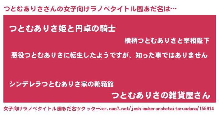 | 男性向けラノベタイトル風あだ名 | 『この素晴らしい世界につとむありさを!』 |