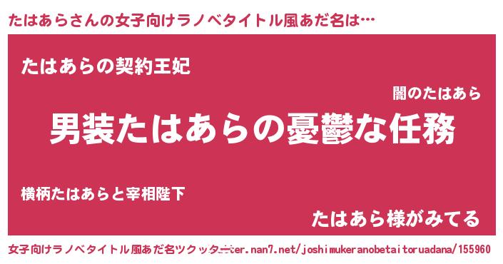 | 男性向けラノベタイトル風あだ名 | 『うちのたはあらが世界を掌握している!』 |