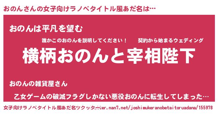 | 男性向けラノベタイトル風あだ名 | 『おのんに滅ぼされるだけの簡単なお仕事です』 |