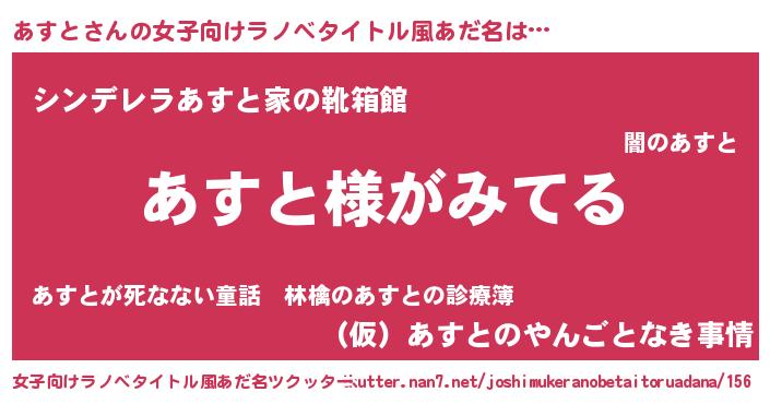 | 男性向けラノベタイトル風あだ名 | 『あすとの嫁は女の子じゃないと思った?』 |
