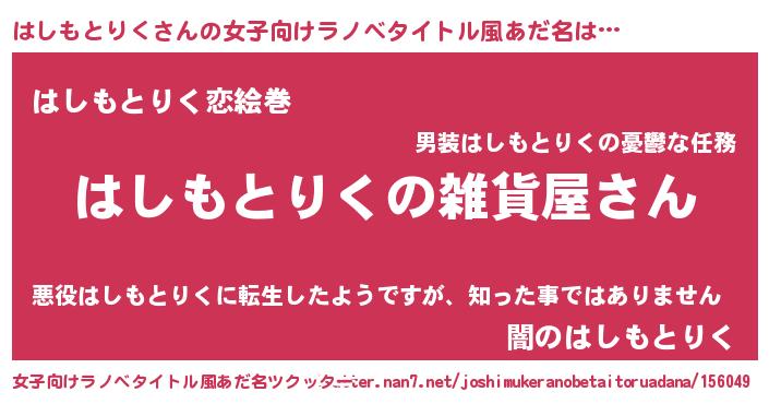 | 男性向けラノベタイトル風あだ名 | 『やはりはしもとりくの青春ラブコメはまちがっている 』 |