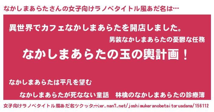 | 男性向けラノベタイトル風あだ名 | 『なかしまあらた~年齢イコール彼女いない歴の魔法使い~』 |