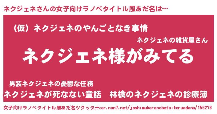 | 男性向けラノベタイトル風あだ名 | 『ネクジェネの嫁は女の子じゃないと思った?』 |