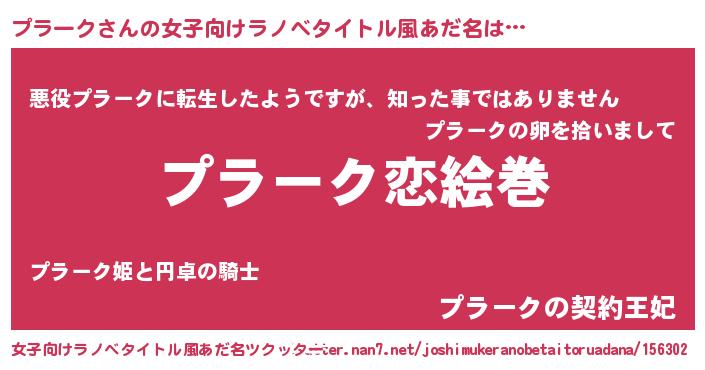 | 男性向けラノベタイトル風あだ名 | 『おまえをオタクにしてやるから、俺をプラークにしてくれ! 』 |