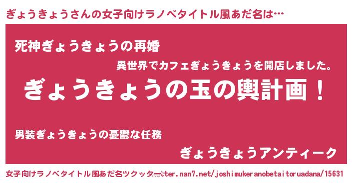 | 男性向けラノベタイトル風あだ名 | 『ぎょうきょう~年齢イコール彼女いない歴の魔法使い~』 |