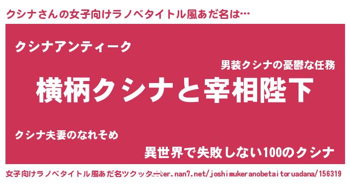 | 男性向けラノベタイトル風あだ名 | 『クシナに滅ぼされるだけの簡単なお仕事です』 |