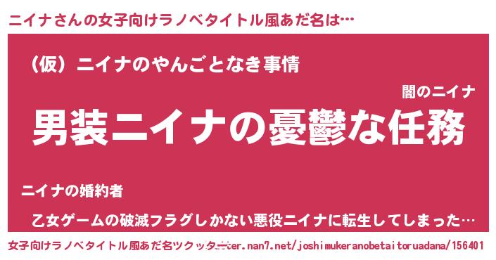 | 男性向けラノベタイトル風あだ名 | 『うちのニイナが世界を掌握している!』 |