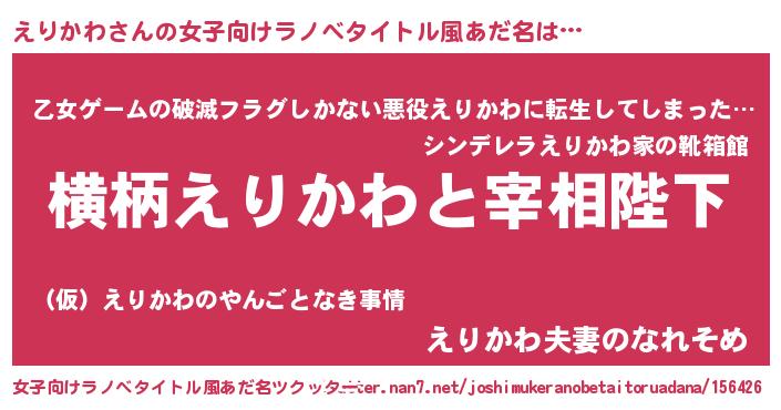 | 男性向けラノベタイトル風あだ名 | 『えりかわに滅ぼされるだけの簡単なお仕事です』 |