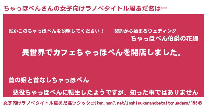| 男性向けラノベタイトル風あだ名 | 『誰もが恐れるあのちゃっほぺんが、ぼくの専属メイドになるようです。』 |