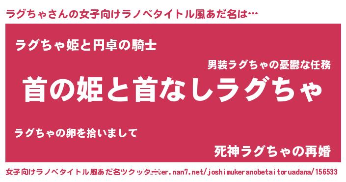 ラグちゃさんの女子向けラノベタイトル風あだ名は… 『首の姫と首なしラグちゃ』『ラグちゃ姫と円卓の騎士』『死神ラグちゃの再婚』 ツクッター #女子向けラノベタイトル風あだ名ツクッター http://tkutter.nan7.net/joshimukeranobetaitoruadana/156533/