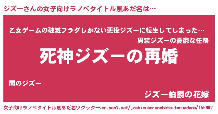ジズーさんの女子向けラノベタイトル風あだ名は… 『死神ジズーの再婚』『乙女ゲームの破滅フラグしかない悪役ジズーに転生してしまった…』『ジズー伯爵の花嫁』 ツクッター #女子向けラノベタイトル風あだ名ツクッター http://tkutter.nan7.net/joshimukeranobetaitoruadana/156907/