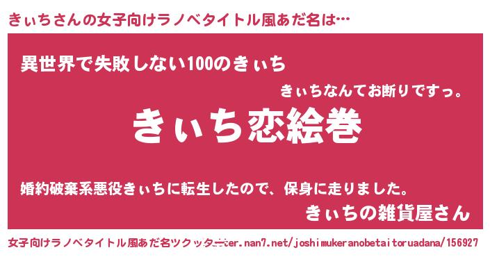 | 男性向けラノベタイトル風あだ名 | 『おまえをオタクにしてやるから、俺をきぃちにしてくれ! 』 |