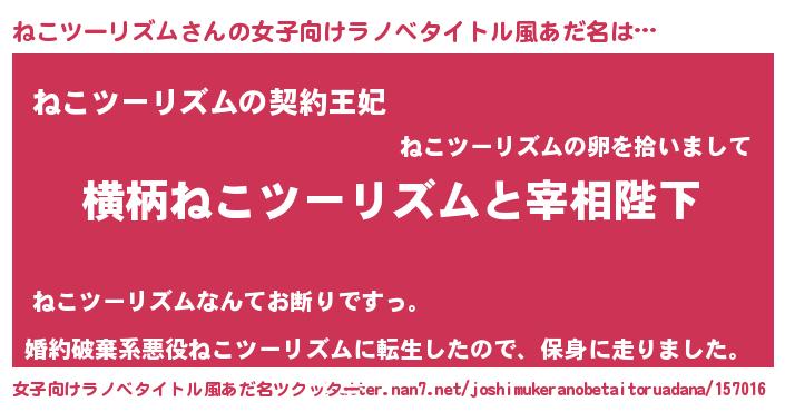 | 男性向けラノベタイトル風あだ名 | 『ねこツーリズムに滅ぼされるだけの簡単なお仕事です』 |