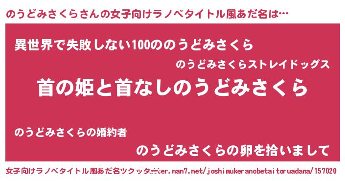 のうどみさくらさんの女子向けラノベタイトル風あだ名は… 『首の姫と首なしのうどみさくら』『異世界で失敗しない100ののうどみさくら』『のうどみさくらの卵を拾いまして』 ツクッター #女子向けラノベタイトル風あだ名ツクッター http://tkutter.nan7.net/joshimukeranobetaitoruadana/157020/