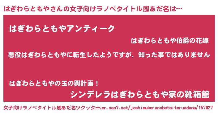 | 男性向けラノベタイトル風あだ名 | 『この素晴らしい世界にはぎわらともやを!』 |