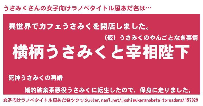 | 男性向けラノベタイトル風あだ名 | 『うさみくに滅ぼされるだけの簡単なお仕事です』 |