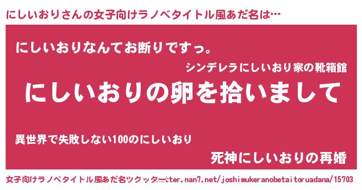 | 男性向けラノベタイトル風あだ名 | 『にしいおりの嫁は女の子じゃないと思った?』 |