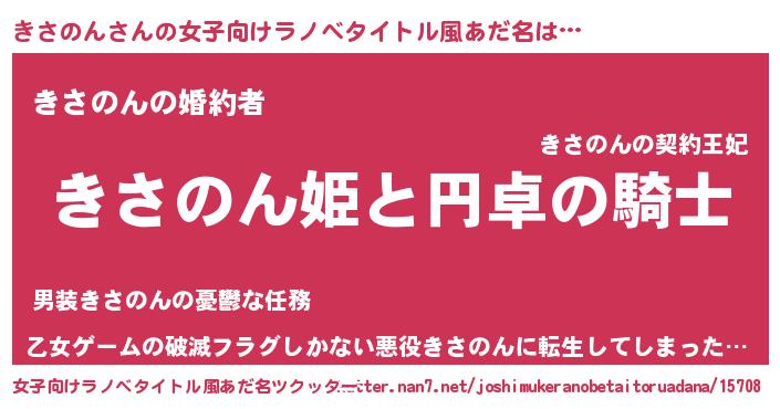 きさのんさんの女子向けラノベタイトル風あだ名は… 『きさのん姫と円卓の騎士』『きさのんの婚約者』『乙女ゲームの破滅フラグしかない悪役きさのんに転生してしまった…』 ツクッター #女子向けラノベタイトル風あだ名ツクッター http://tkutter.nan7.net/joshimukeranobetaitoruadana/15708/