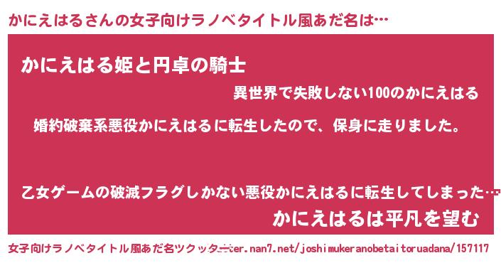 | 胡散臭い通販商品みたいなあだ名 | 『必ず成功する霊験あらたかなお札…その名も「かにえはる」』 |