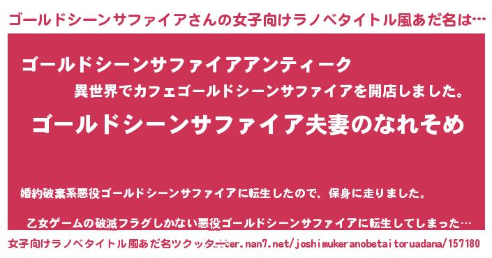 | 男性向けラノベタイトル風あだ名 | 『おまえをオタクにしてやるから、俺をゴールドシーンサファイアにしてくれ! 』 |
