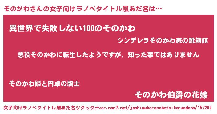 | 男性向けラノベタイトル風あだ名 | 『この素晴らしい世界にそのかわを!』 |