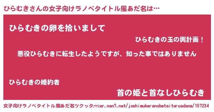 | 男性向けラノベタイトル風あだ名 | 『この素晴らしい世界にひらむきを!』 |
