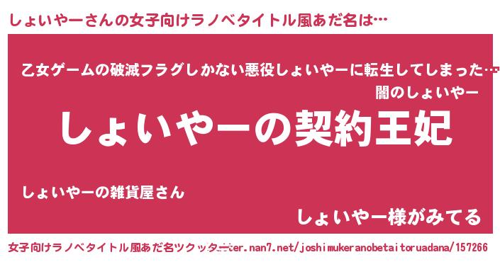 | 男性向けラノベタイトル風あだ名 | 『しょいやーという概念が存在しない退屈な世界 』 |
