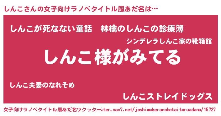 しんこさんの女子向けラノベタイトル風あだ名は… 『しんこ様がみてる』『しんこが死なない童話 林檎のしんこの診療簿』『しんこストレイドッグス』 ツクッター #女子向けラノベタイトル風あだ名ツクッター http://tkutter.nan7.net/joshimukeranobetaitoruadana/15727/