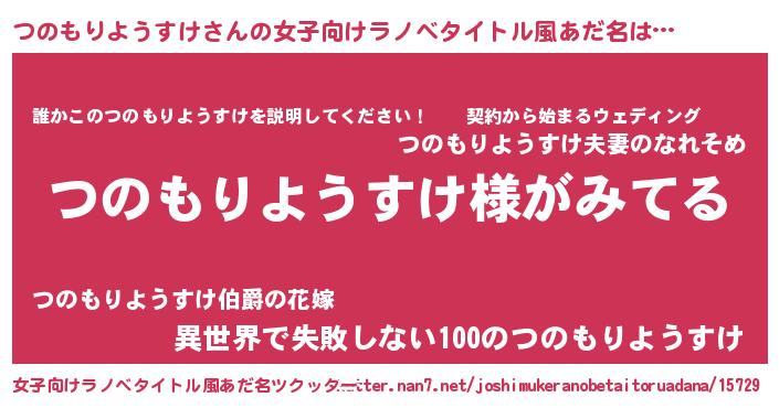 | 男性向けラノベタイトル風あだ名 | 『つのもりようすけの嫁は女の子じゃないと思った?』 |