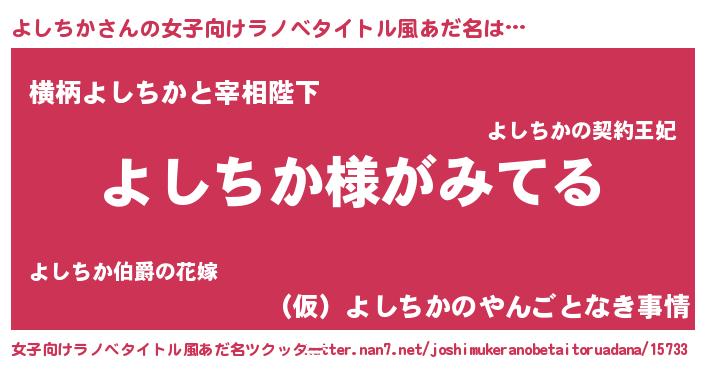 | 男性向けラノベタイトル風あだ名 | 『よしちかの嫁は女の子じゃないと思った?』 |