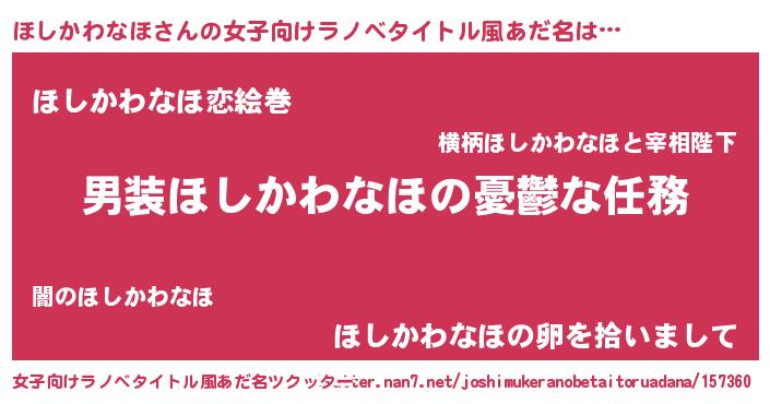 ほしかわなほさんの女子向けラノベタイトル風あだ名は… 『男装ほしかわなほの憂鬱な任務』『ほしかわなほ恋絵巻』『ほしかわなほの卵を拾いまして』 ツクッター #女子向けラノベタイトル風あだ名ツクッター http://tkutter.nan7.net/joshimukeranobetaitoruadana/157360/