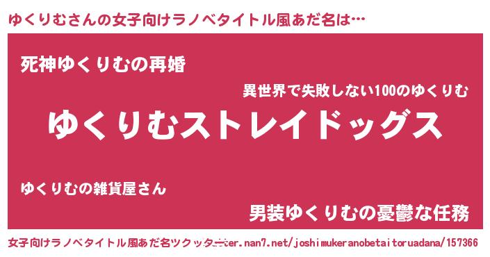 | 男性向けラノベタイトル風あだ名 | 『Re:ゆくりむから始める異世界生活』 |