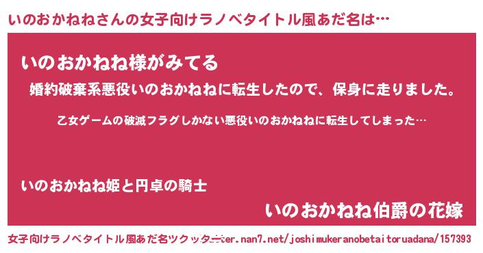| 男性向けラノベタイトル風あだ名 | 『魔弾の王といのおかねね』 |