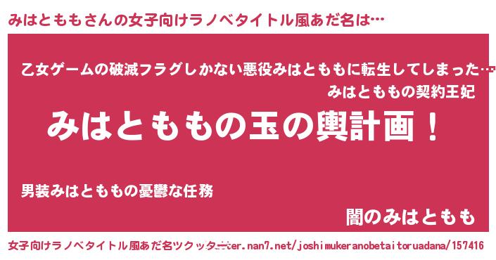 | 胡散臭い通販商品みたいなあだ名 | 『あなたにだけ特別に提供する世界で10本だけ現存している希少なブランデー…その名も「みはともも」』 |
