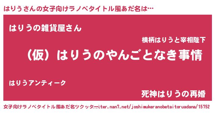 | 男性向けラノベタイトル風あだ名 | 『はりうの憂鬱』『魔法科高校のはりう』 |
