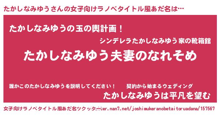 | 男性向けラノベタイトル風あだ名 | 『おまえをオタクにしてやるから、俺をたかしなみゆうにしてくれ! 』 |