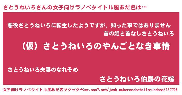 | 胡散臭い通販商品みたいなあだ名 | 『必ず成功する霊験あらたかなお札…その名も「さとうねいろ」』 |