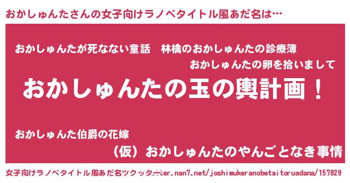 | 男性向けラノベタイトル風あだ名 | 『おかしゅんた~年齢イコール彼女いない歴の魔法使い~』 |