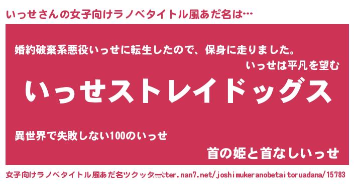 | 男性向けラノベタイトル風あだ名 | 『Re:いっせから始める異世界生活』 |