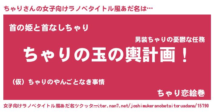 | 男性向けラノベタイトル風あだ名 | 『ちゃり~年齢イコール彼女いない歴の魔法使い~』 |