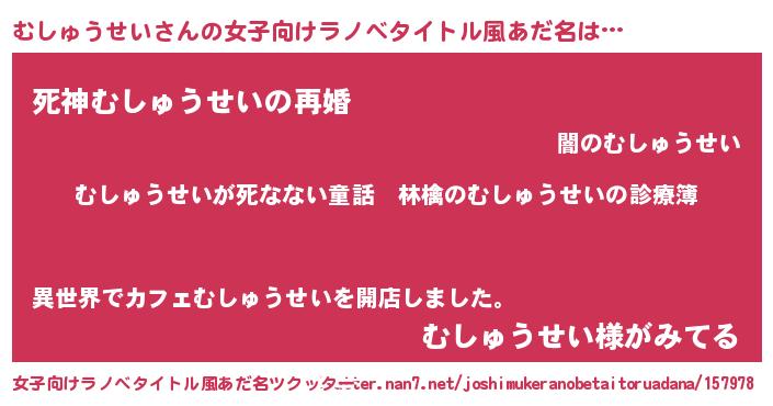 むしゅうせいさんの女子向けラノベタイトル風あだ名は… 『むしゅうせいが死なない童話 林檎のむしゅうせいの診療簿』『死神むしゅうせいの再婚』『むしゅうせい様がみてる』 ツクッター #女子向けラノベタイトル風あだ名ツクッター http://tkutter.nan7.net/joshimukeranobetaitoruadana/157978/