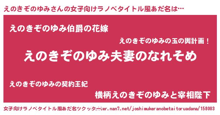 | 男性向けラノベタイトル風あだ名 | 『おまえをオタクにしてやるから、俺をえのきぞのゆみにしてくれ! 』 |