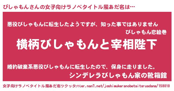 | 男性向けラノベタイトル風あだ名 | 『びしゃもんに滅ぼされるだけの簡単なお仕事です』 |