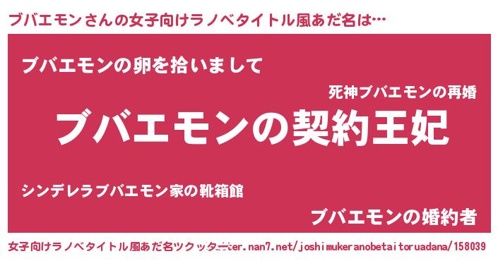 | 男性向けラノベタイトル風あだ名 | 『ブバエモンという概念が存在しない退屈な世界 』 |