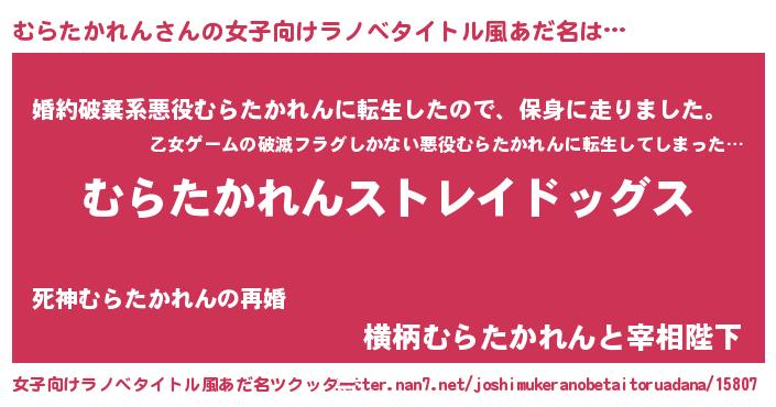 | 男性向けラノベタイトル風あだ名 | 『Re:むらたかれんから始める異世界生活』 |