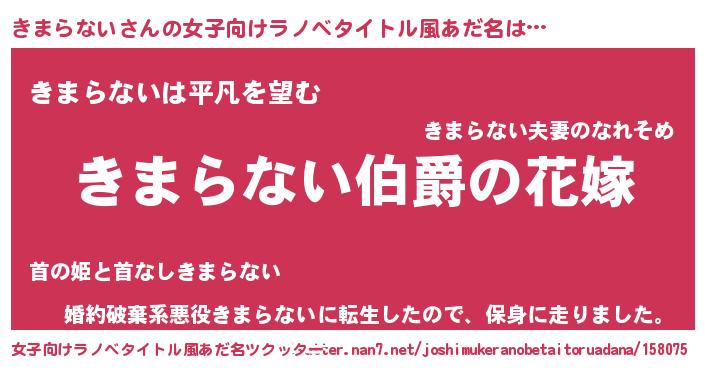 | 男性向けラノベタイトル風あだ名 | 『やはりきまらないの青春ラブコメはまちがっている 』 |