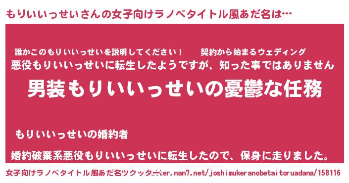 | 男性向けラノベタイトル風あだ名 | 『冴えないもりいいっせいの育てかた』 |